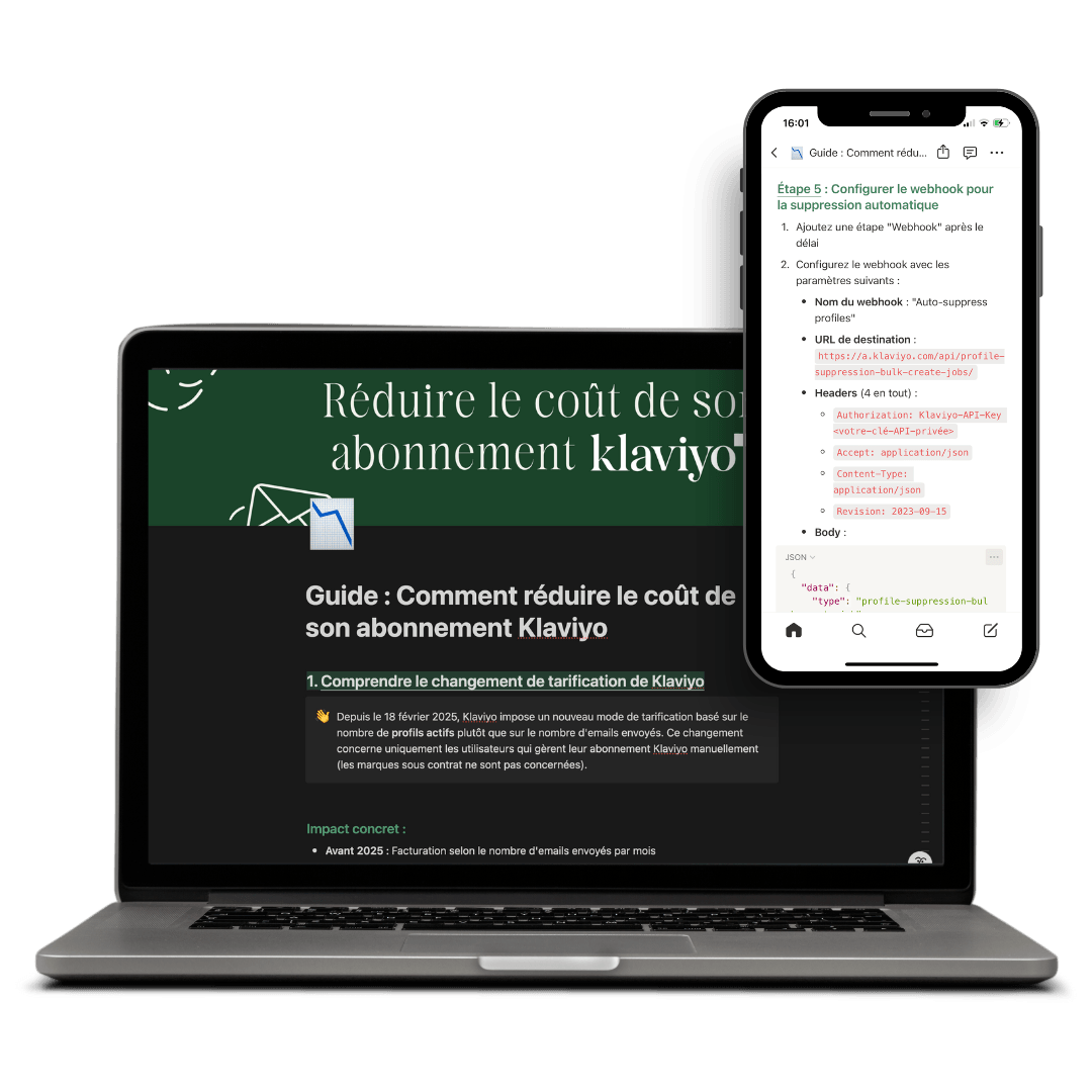 Accédez à toutes nos ressources où que vous soyez grâce à leur compatibilité mobile. Hébergées sur des plateformes comme Notion et Google Sheet, nos ressources sont consultables à tout moment depuis votre smartphone ou tablette, vous permettant de gérer vos campagnes Klaviyo même en déplacement.